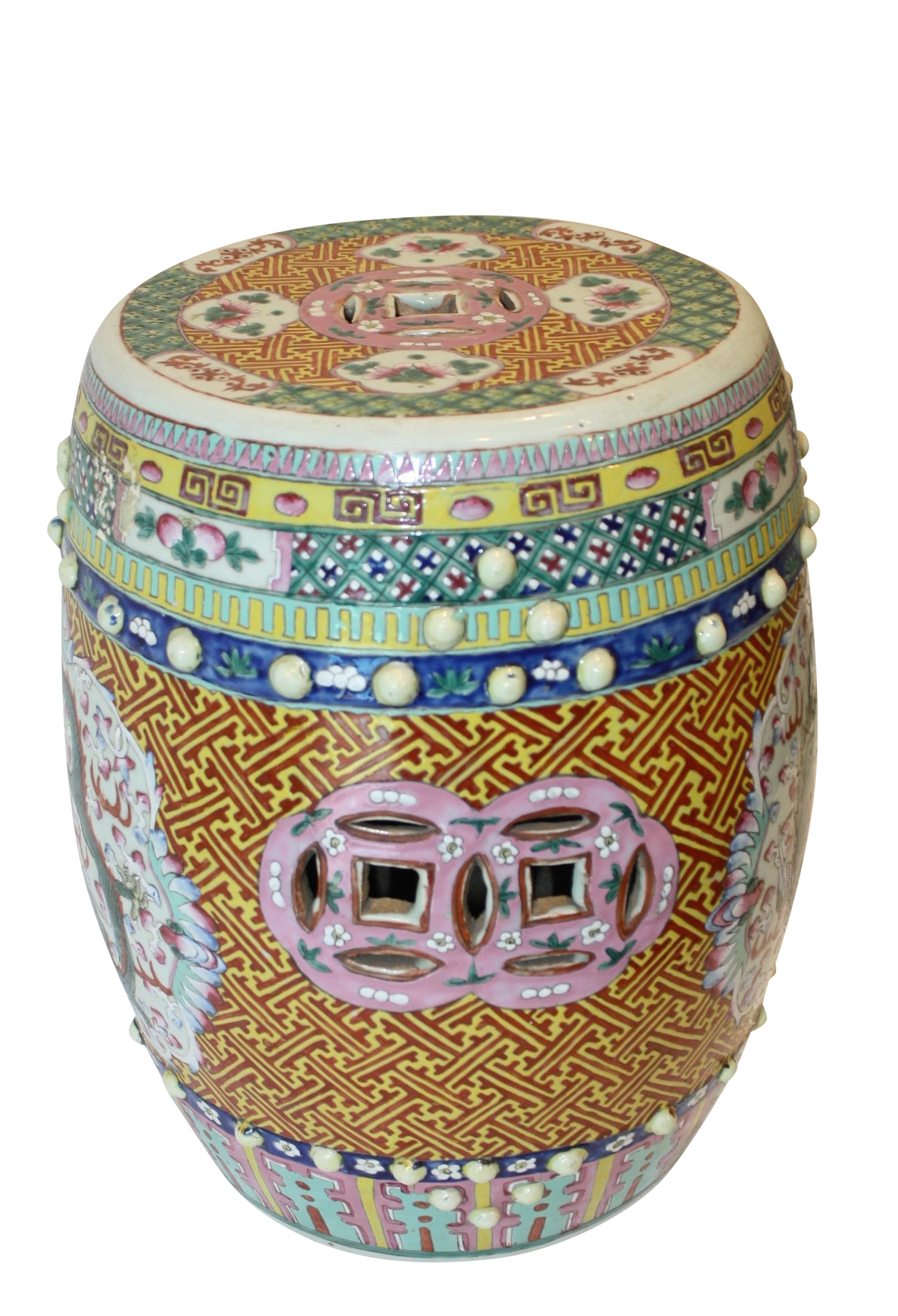 Original owner, well cared for chinese garden stool. This is a handmade vintage ceramic garden stool with detailed intricate filigree panels.